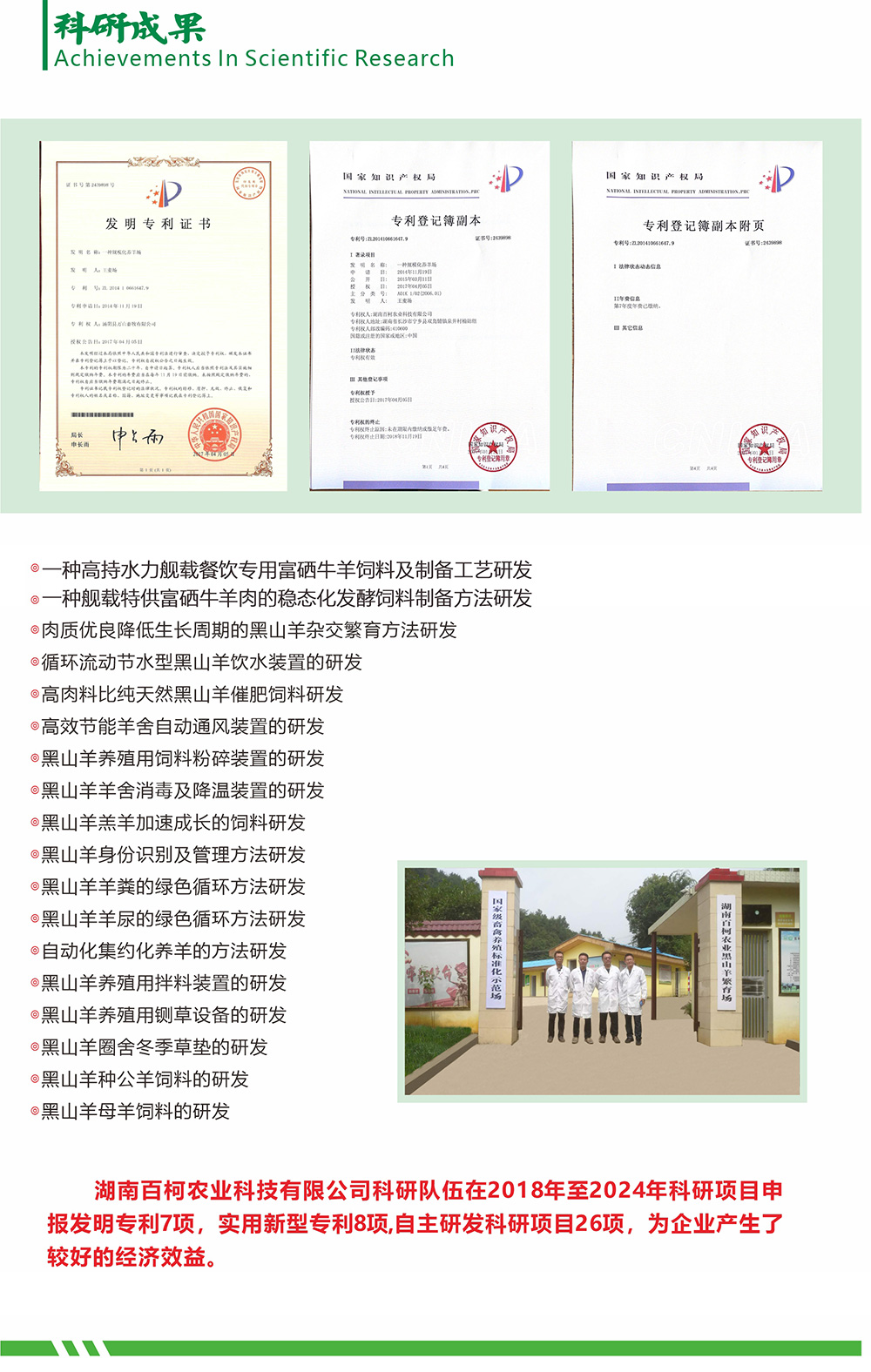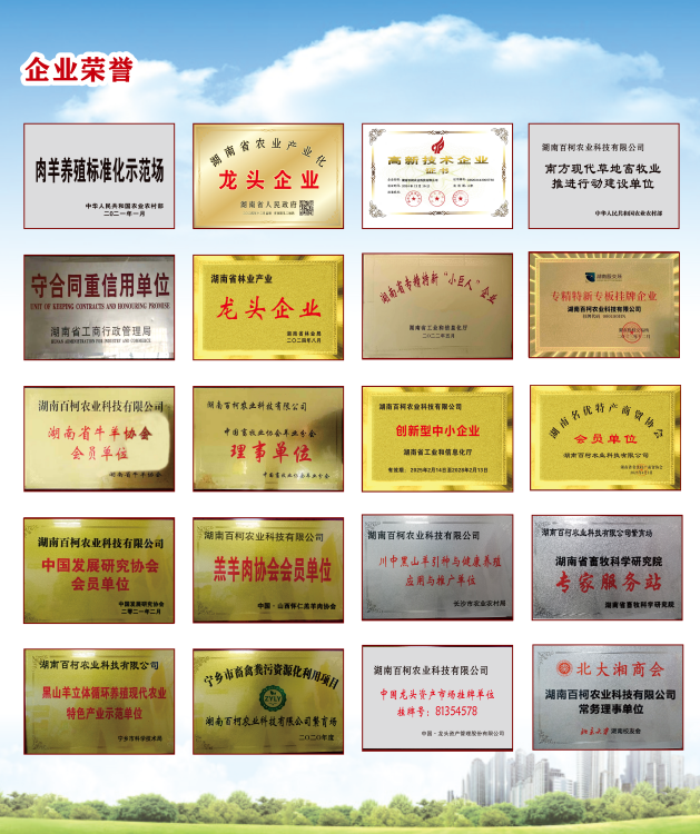 公司生态养殖基地是国家级畜禽养殖标准化示范基地、湖南省肉羊养殖标准化示范场;公司是国家级高新技术企业、湖南省专精特新“小巨人”企业,专精特新专板挂牌企业 挂牌代码:000180HN、湖南省农业产业化重点龙头企业、湖南省林业产业化重点龙头企业、国家级肉羊标准化示范场、中国畜牧业协会羊业分会理事单位,企业通过了ISO9001质量管理体系认证。2025年9月25日国家知识产权局对百柯农业的专利“一种舰载特供富硒牛羊肉的稳态化发酵饲料制备方法”初审通过。